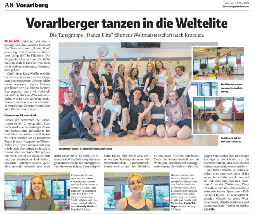 Nach einer pandemiebedingten Pause von 2 Jahren, hat die Crew der Dance Elite, letzte Woche, wieder bei den World Dance Masters in Porec/Kroatien teilgenommen. Bei der internationalen Qualifikation konnten sich am Dienstag, alle 7 vorgetragenen Choreographien, für das Finale qualifizieren.